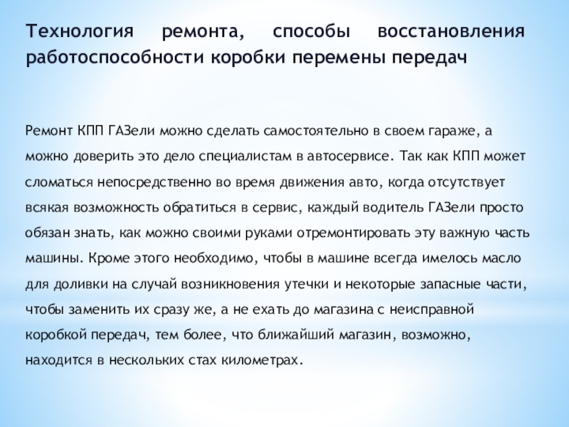 дело специалистам в автосервисе. Так как КПП может сломаться непосредственно во время движения авто, когда отсутствует всякая возможность обратиться в сервис, каждый водитель ГАЗели просто обязан знать, как можно своими руками отремонтировать эту важную часть машины. Кроме этого необходимо, чтобы в машине всегда имелось масло для доливки на случай возникновения утечки и некоторые запасные части, чтобы заменить их сразу же, а не ехать до магазина с неисправной коробкой передач, тем более, что ближайший магазин, возможно, находится в нескольких стах километрах.