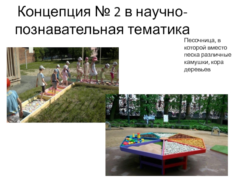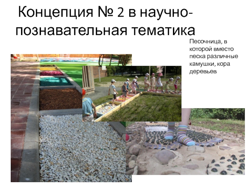 Концепция № 2 в научно-познавательная тематикаПесочница, в которой вместо песка различные камушки, кора деревьев