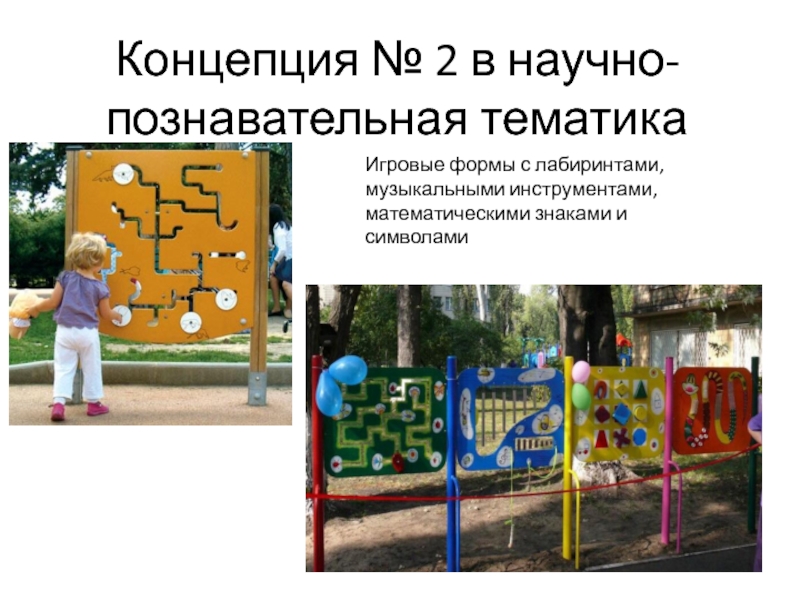 Концепция № 2 в научно-познавательная тематикаИгровые формы с лабиринтами, музыкальными инструментами, математическими знаками и символами