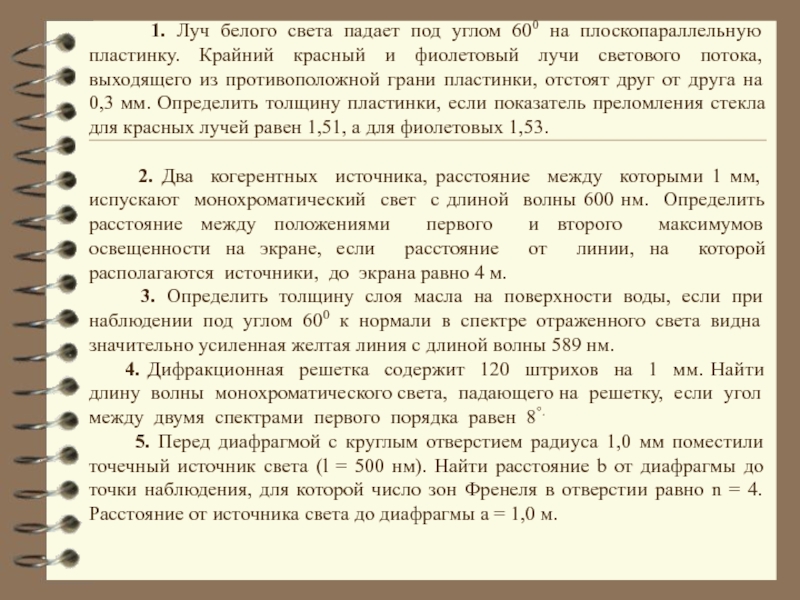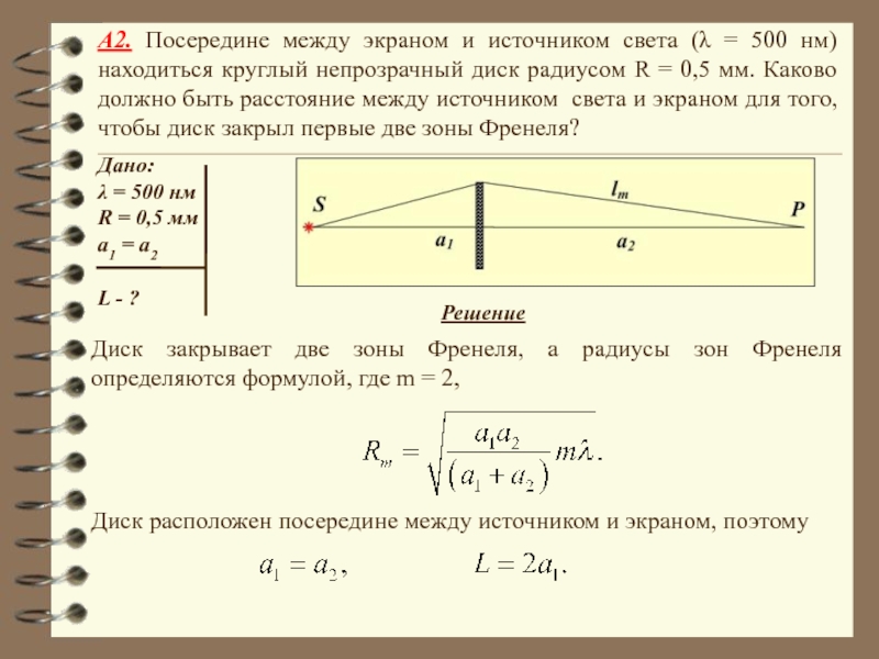 За диафрагмой на расстоянии L = 3 м от нее находится экран. Какое число m зон Френеля укладывается в отверстии диафрагмы, если точка наблюдения находится на экране напротив центра отверстия? Каким будет центр дифракционной картины на экране – темным или светлым?Дано: