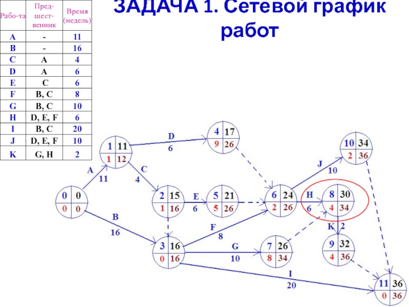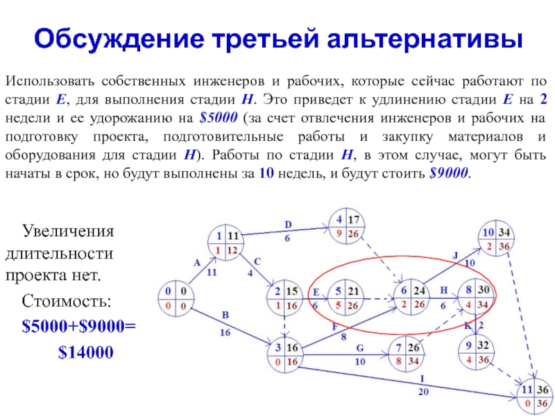 3. Использовать собственных инженеров и рабочих, которые сейчас работают по стадии Е, для выполнения стадии H. Это приведет к удлинению стадии Е на 2 недели и ее удорожанию на $5000 (за счет отвлечения инженеров и рабочих на подготовку проекта, подготовительные работы и закупку материалов и оборудования для стадии H). Работы по стадии H, в этом случае, могут быть начаты в срок, но будут выполнены за 10 недель, и будут стоить $9000.