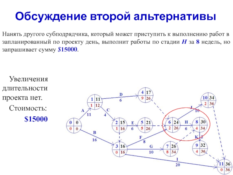 2. Нанять другого субподрядчика, который может приступить к выполнению работ в запланированный по проекту день, выполнит работы по стадии H за 8 недель, но запрашивает сумму $15000.