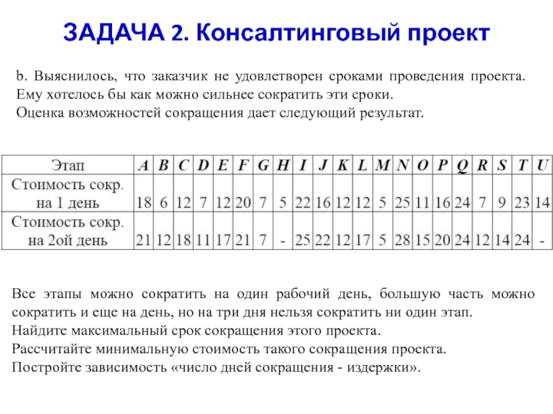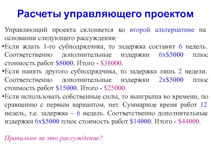 позже запланированного в проекте «раннего» старта. Каждая неделя отсрочки окончания проекта стоит организаторам $5000.Рассматриваются три альтернативы разрешения проблемы.