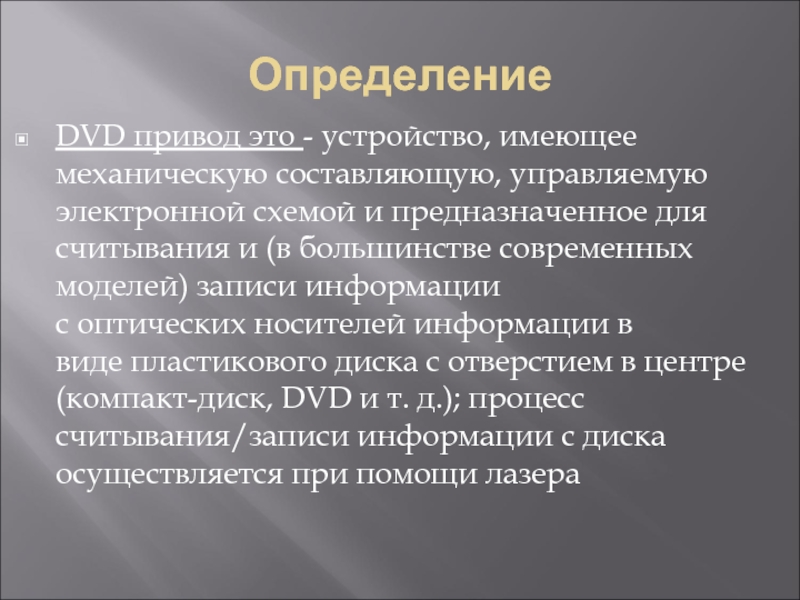 ОпределениеDVD привод это - устройство, имеющее механическую составляющую, управляемую электронной схемой и предназначенное для считывания и (в