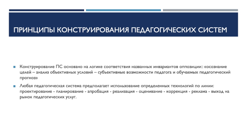 возможности педагога и обучаемых педагогический прогноз»Любая педагогическая система предполагает использование определенных технологий по линии: проектирование - планирование - апробация - реализация - оценивание - коррекция - реклама - выход на рынок педагогических услуг.
