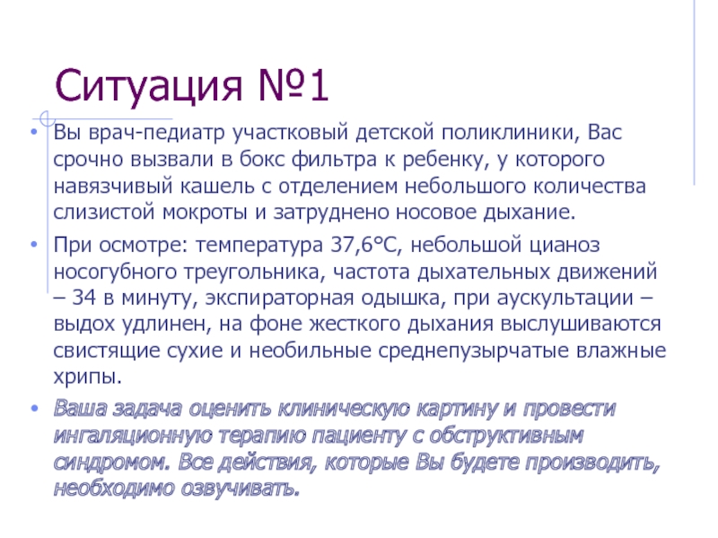 Ваша задача оценить клиническую картину и провести ингаляционную терапию пациенту с обструктивным синдромом. Все действия, которые Вы будете производить, необходимо озвучивать.