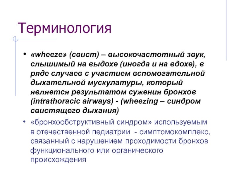 «wheeze» (свист) – высокочастотный звук, слышимый на выдохе (иногда и