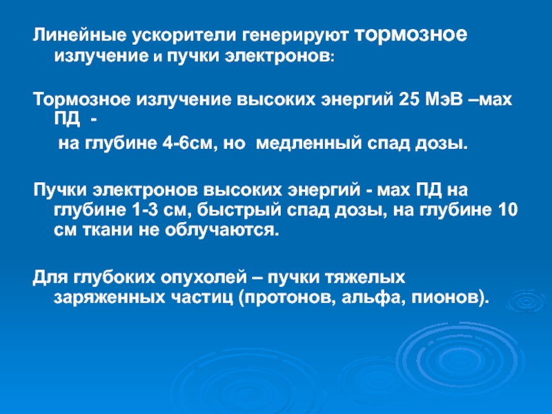 Пучки электронов высоких энергий - мах ПД на глубине 1-3 см, быстрый спад дозы, на глубине 10 см ткани не облучаются.