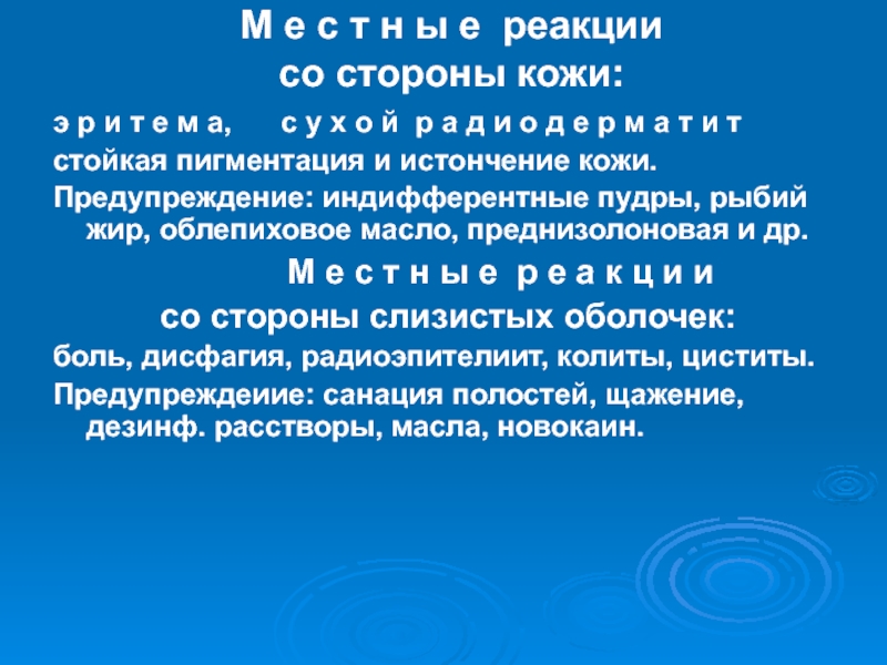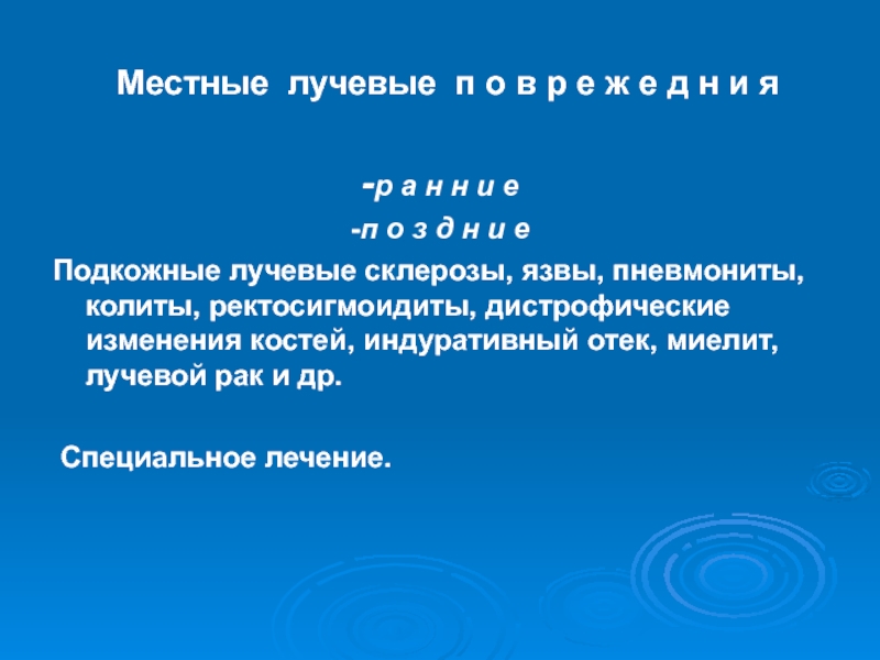 Подкожные лучевые склерозы, язвы, пневмониты, колиты, ректосигмоидиты, дистрофические изменения костей, индуративный отек, миелит, лучевой рак и др.