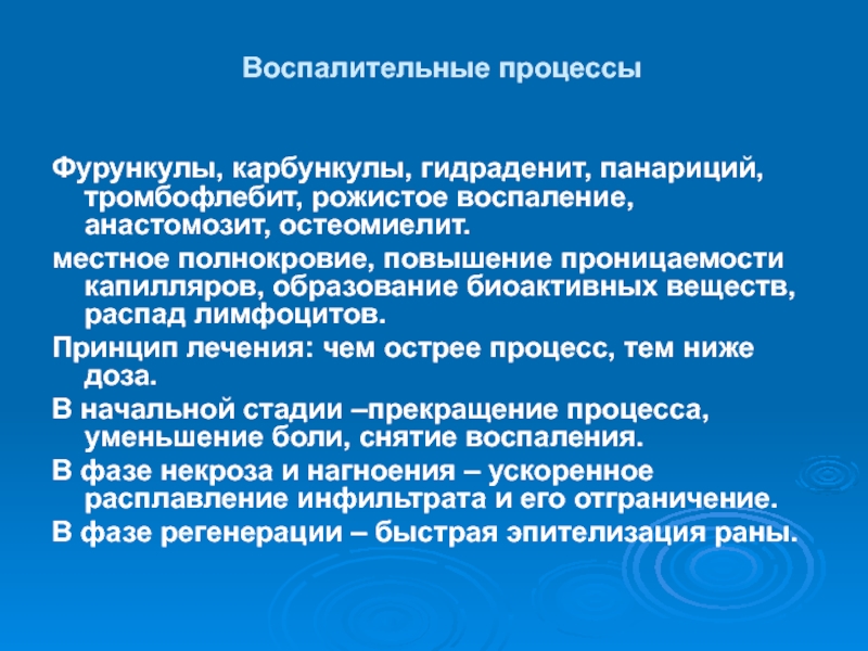 Фурункулы, карбункулы, гидраденит, панариций, тромбофлебит, рожистое воспаление, анастомозит, остеомиелит.