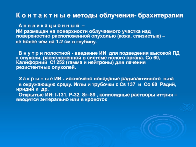 В н у т р и полостной - введение ИИ для подведения высокой ПД к опухоли, расположенной в системе полого органа. Со 60, Калифорний Cf 252 (гамма и нейтроны) для лечения резистентных опухолей.