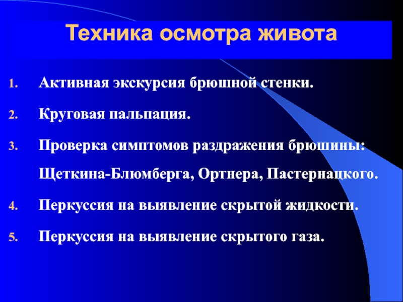 Техника осмотра живота Активная экскурсия брюшной стенки. Круговая пальпация.Проверка симптомов раздражения брюшины: Щеткина-Блюмберга, Ортнера, Пастернацкого.Перкуссия на выявление