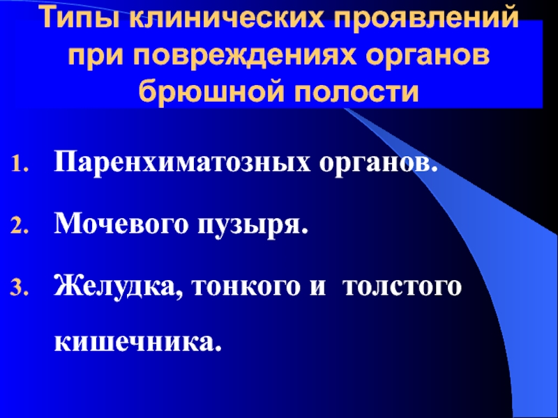 Типы клинических проявлений при повреждениях органов брюшной полости Паренхиматозных органов. Мочевого пузыря.Желудка, тонкого и толстого кишечника.