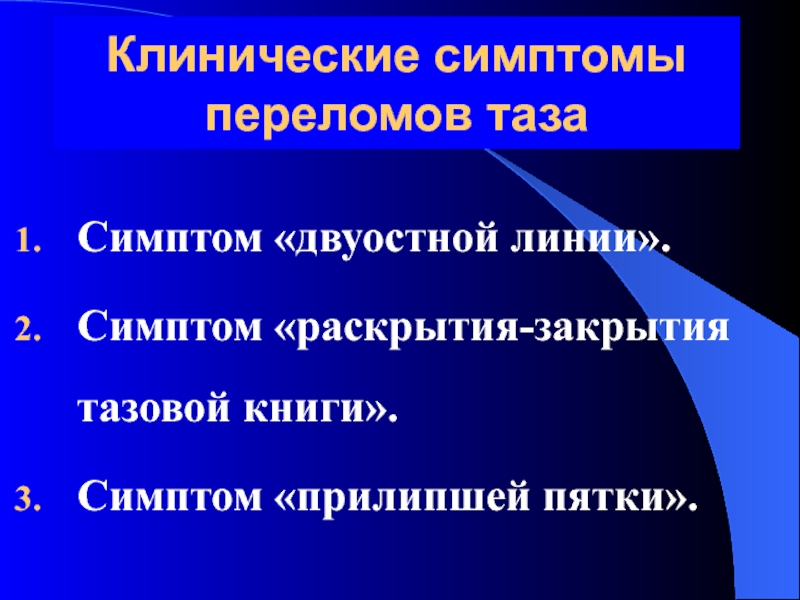 Клинические симптомы переломов таза Симптом «двуостной линии».Симптом «раскрытия-закрытия тазовой книги».Симптом «прилипшей пятки».