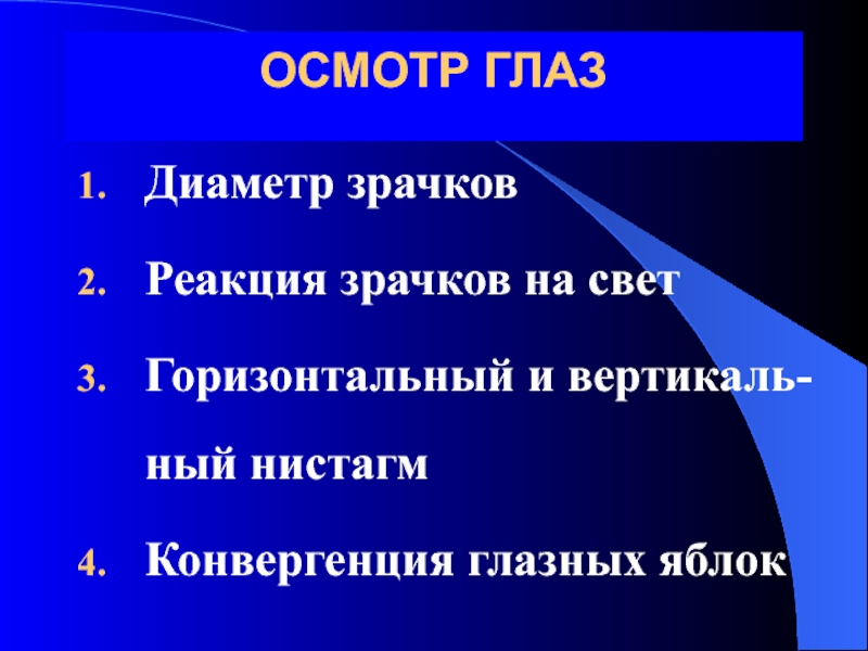 ОСМОТР ГЛАЗ Диаметр зрачковРеакция зрачков на светГоризонтальный и вертикаль-ный нистагмКонвергенция глазных яблок