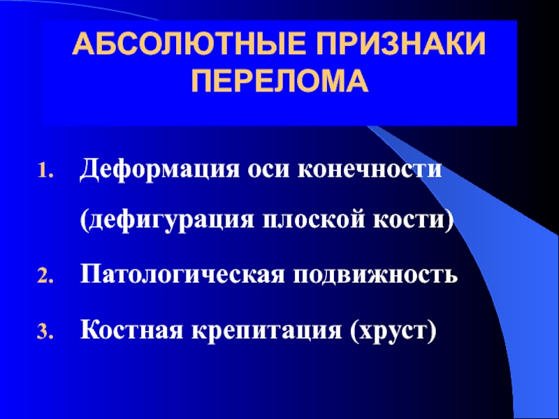 АБСОЛЮТНЫЕ ПРИЗНАКИ ПЕРЕЛОМА Деформация оси конечности (дефигурация плоской кости)Патологическая подвижностьКостная крепитация (хруст)