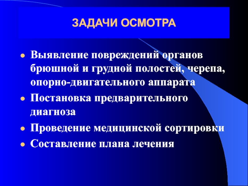 ЗАДАЧИ ОСМОТРАВыявление повреждений органов брюшной и грудной полостей, черепа, опорно-двигательного аппаратаПостановка предварительного диагнозаПроведение медицинской сортировкиСоставление плана лечения