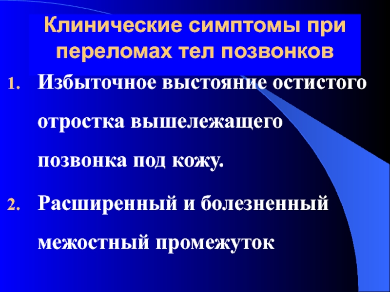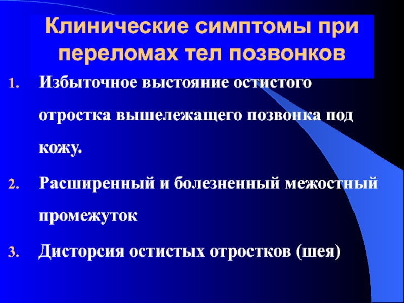 Слайд 11Клинические симптомы при переломах тел позвонков