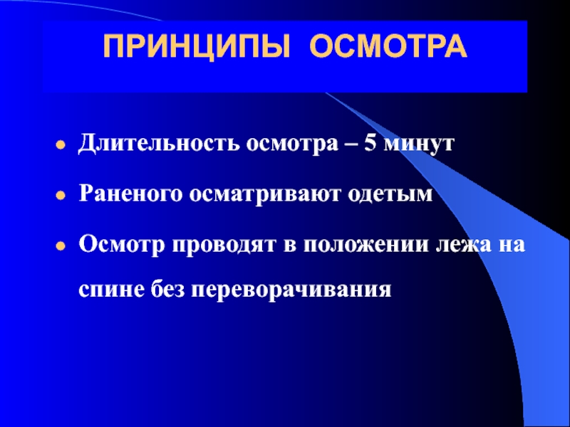 ПРИНЦИПЫ ОСМОТРА Длительность осмотра – 5 минутРаненого осматривают одетымОсмотр проводят в положении лежа на спине без переворачивания