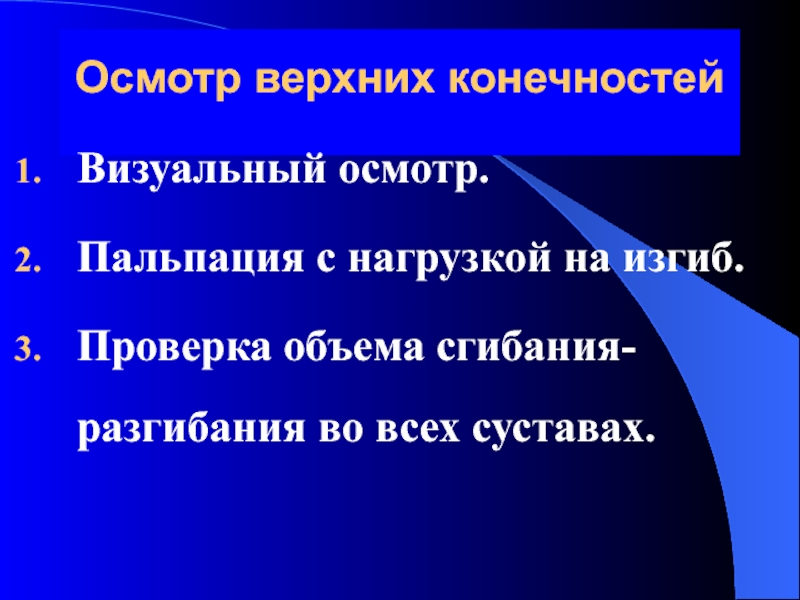 Осмотр верхних конечностей Визуальный осмотр. Пальпация с нагрузкой на изгиб.Проверка объема сгибания-разгибания во всех суставах.