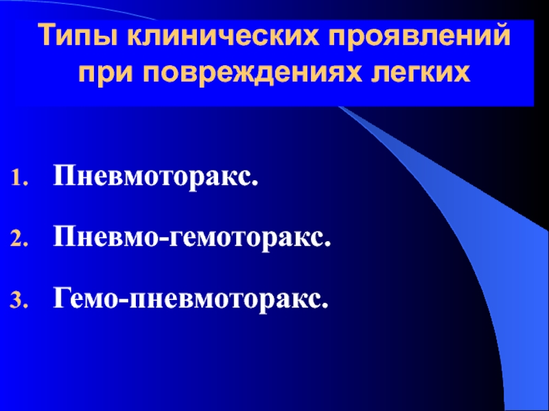 Типы клинических проявлений при повреждениях легких Пневмоторакс. Пневмо-гемоторакс.Гемо-пневмоторакс.