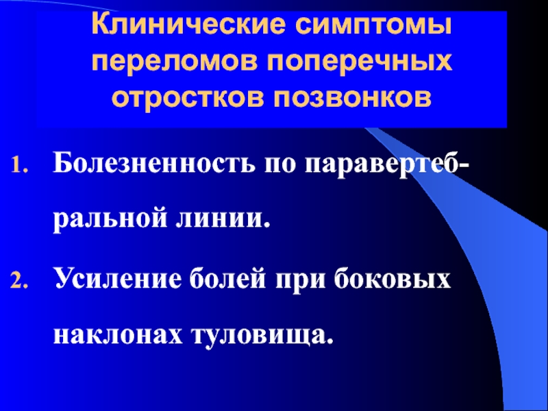 Клинические симптомы переломов поперечных отростков позвонков Болезненность по паравертеб-ральной линии. Усиление болей при боковых наклонах туловища.