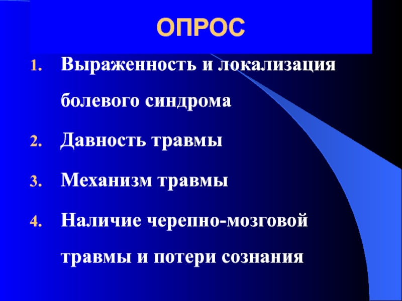 ОПРОСВыраженность и локализация болевого синдромаДавность травмыМеханизм травмыНаличие черепно-мозговой травмы и потери сознания