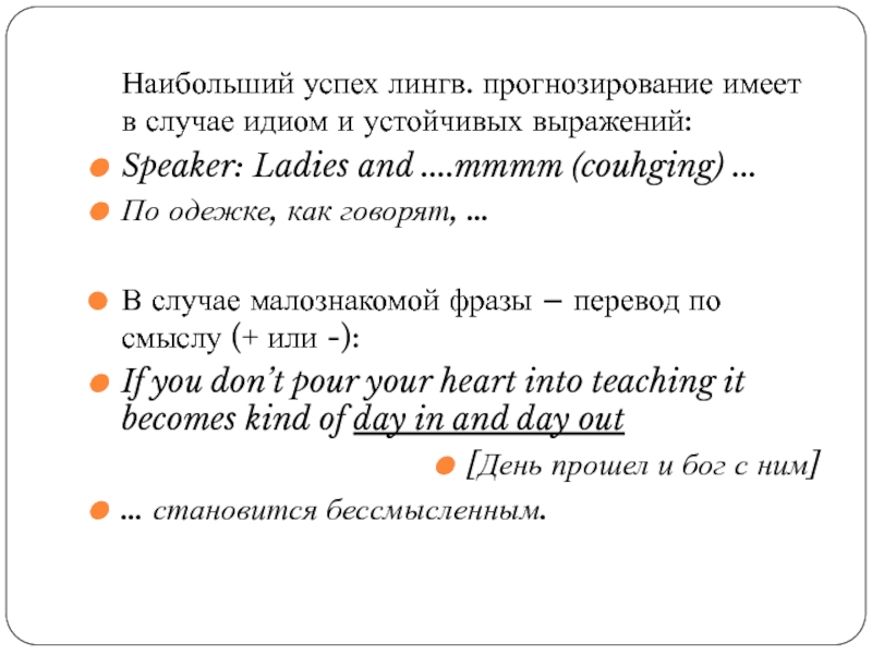 Слайд 18Наибольший успех лингв. прогнозирование имеет в случае идиом и устойчивых