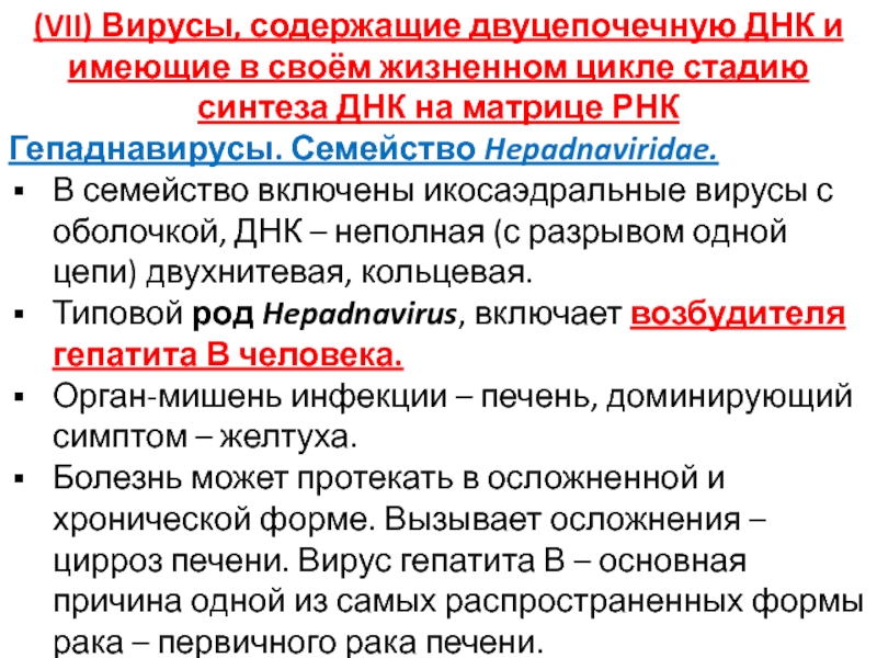 (VII) Вирусы, содержащие двуцепочечную ДНК и имеющие в своём жизненном цикле стадию синтеза ДНК на матрице РНК, ретроидные вирусы (например, вирус гепатита B).