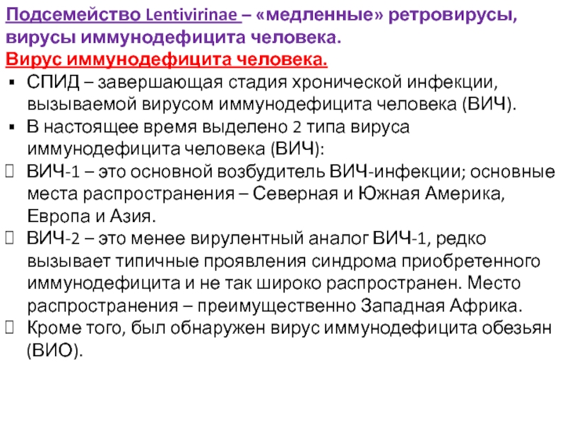 Слайд 34Подсемейство Lentivirinae – «медленные» ретровирусы, вирусы иммунодефицита человека.