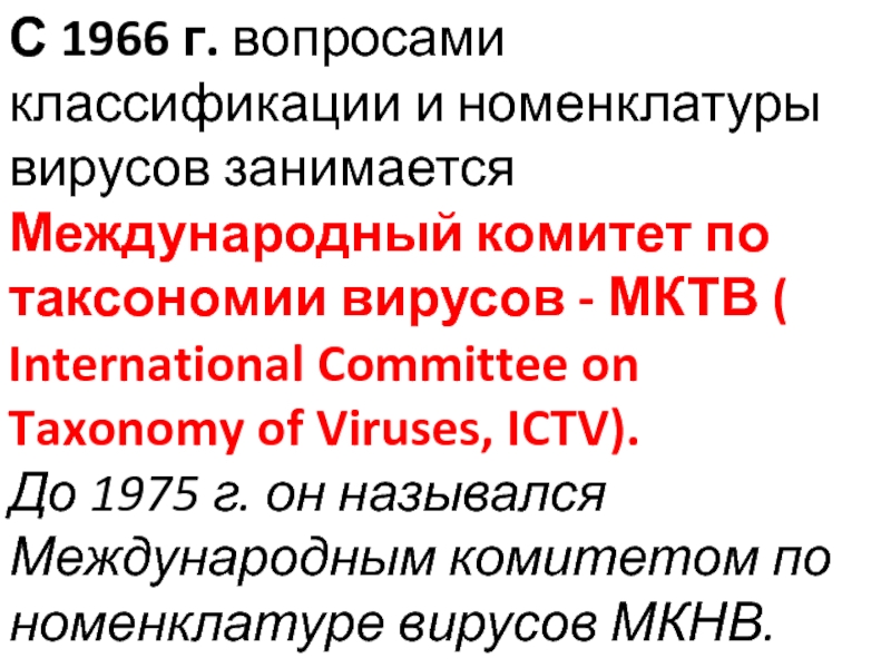 Слайд 4С 1966 г. вопросами классификации и номенклатуры вирусов занимается Международный