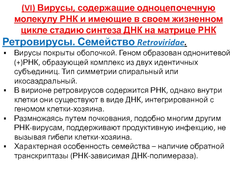 Слайд 32(VI) Вирусы, содержащие одноцепочечную молекулу РНК и имеющие в своем