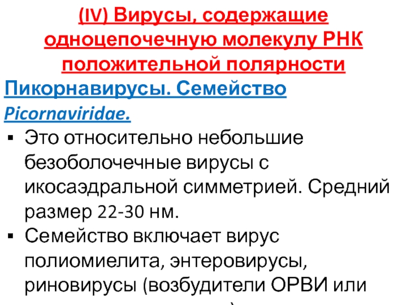Слайд 24(IV) Вирусы, содержащие одноцепочечную молекулу РНК положительной полярности