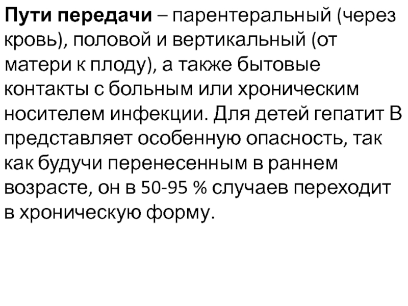 Слайд 41Пути передачи – парентеральный (через кровь), половой и вертикальный (от