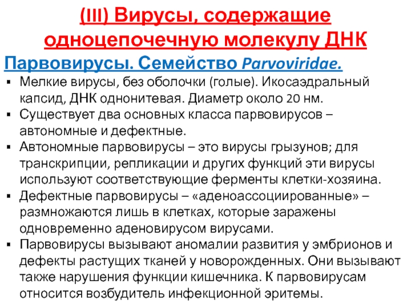 (III) Вирусы, содержащие одноцепочечную молекулу ДНК (например, парвовирусы).