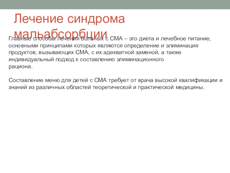 элиминация продуктов, вызывающих СМА, с их адекватной заменой, а также индивидуальный подход к составлению элиминационного