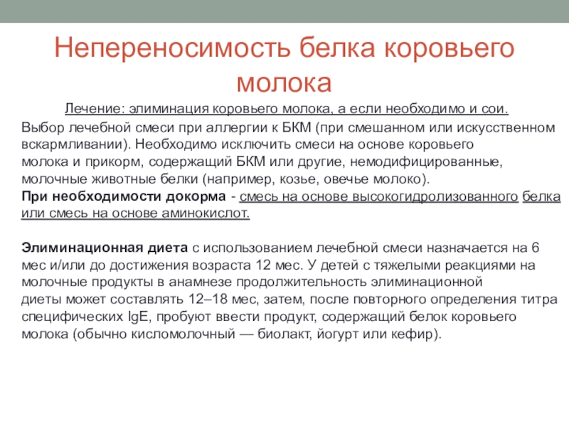 диеты может составлять 12–18 мес, затем, после повторного определения титра специфических IgE, пробуют ввести продукт, содержащий белок коровьего молока (обычно кисломолочный — биолакт, йогурт или кефир).