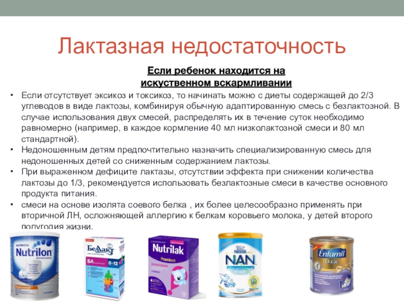 При выраженном дефиците лактазы, отсутствии эффекта при снижении количества лактозы до 1/3, рекомендуется использовать безлактозные смеси в качестве основного продукта питания.