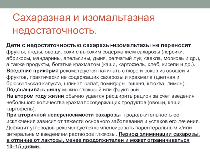 При вторичной непереносимости сахарозы продолжительность ее исключения зависит от тяжести основного заболевания и успехов его лечения. Дефицит углеводов рекомендуется компенсировать парентеральным и/или