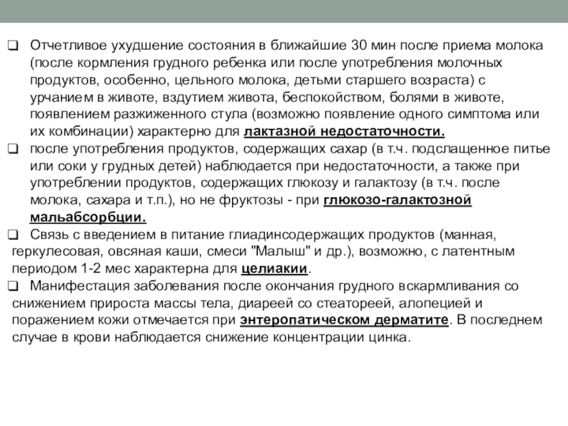 цельного молока, детьми старшего возраста) с урчанием в животе, вздутием живота, беспокойством, болями в животе, появлением разжиженного стула (возможно появление одного симптома или их комбинации) характерно для лактазной недостаточности.