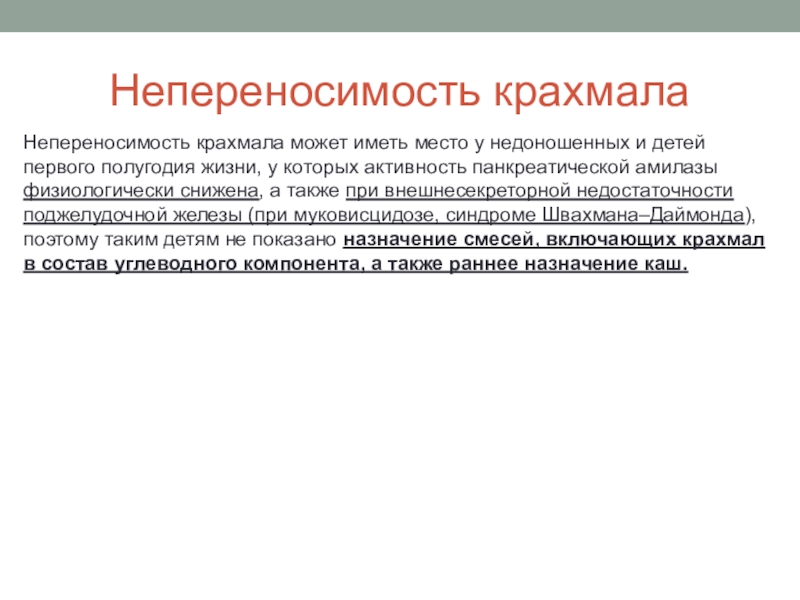 а также при внешнесекреторной недостаточности поджелудочной железы (при муковисцидозе, синдроме Швахмана–Даймонда), поэтому таким детям не показано назначение смесей, включающих крахмал в состав углеводного компонента, а также раннее назначение каш.