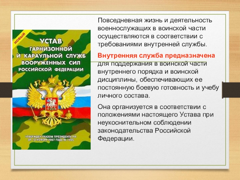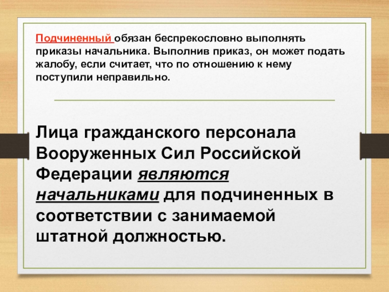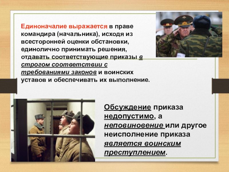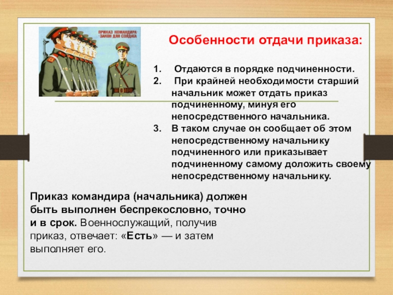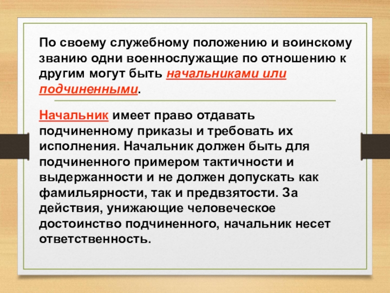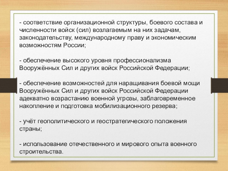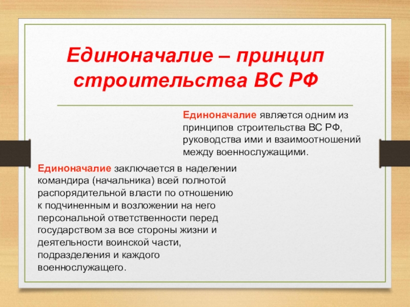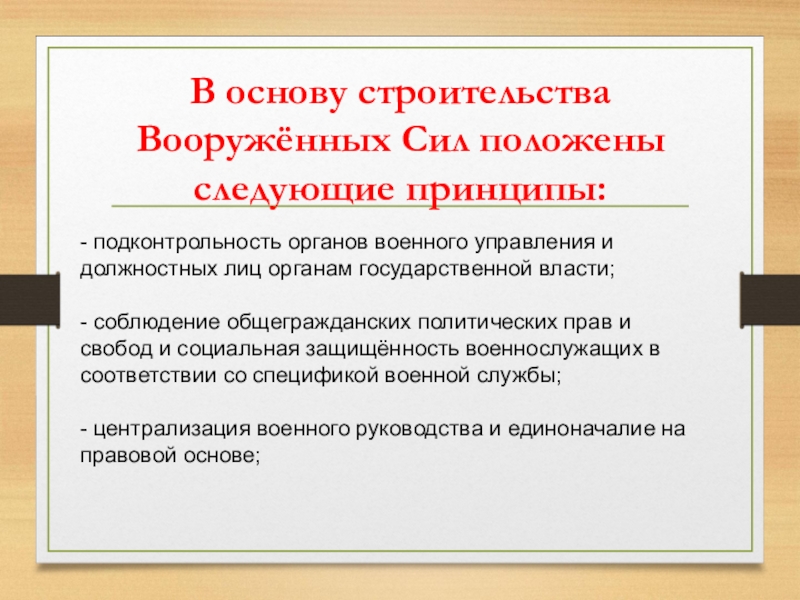 политических прав и свобод и социальная защищённость военнослужащих в соответствии со спецификой военной службы;- централизация военного руководства и единоначалие на правовой основе;