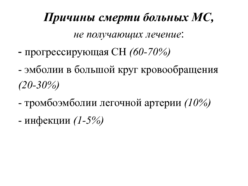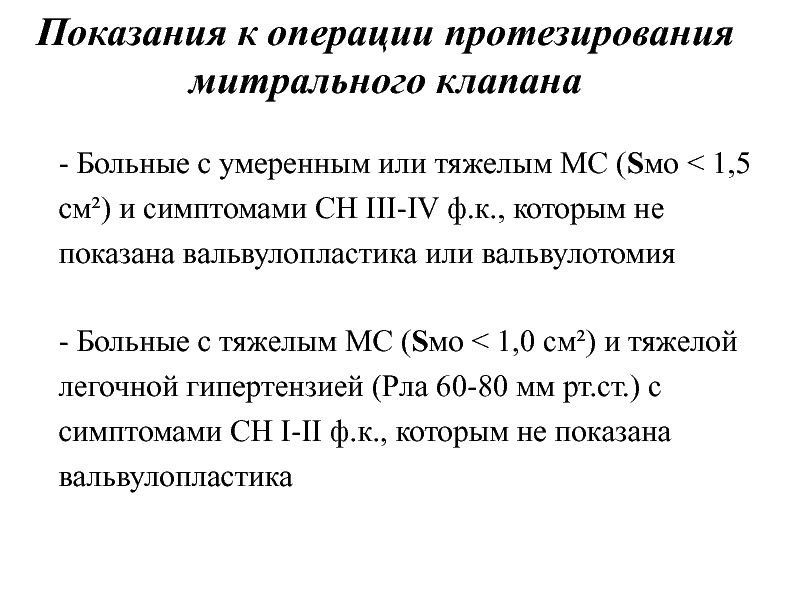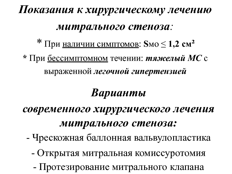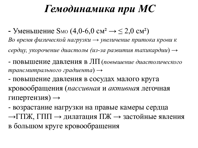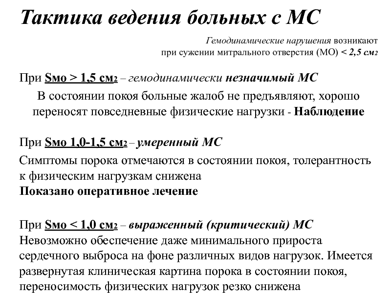 При Sмо < 1,0 см2 – выраженный (критический) МС Невозможно обеспечение даже минимального прироста сердечного выброса на фоне различных видов нагрузок. Имеется развернутая клиническая картина порока в состоянии покоя, переносимость физических нагрузок резко снижена