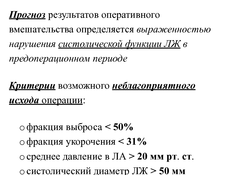 Слайд 26Прогноз результатов оперативного вмешательства определяется выраженностью нарушения систолической функции ЛЖ