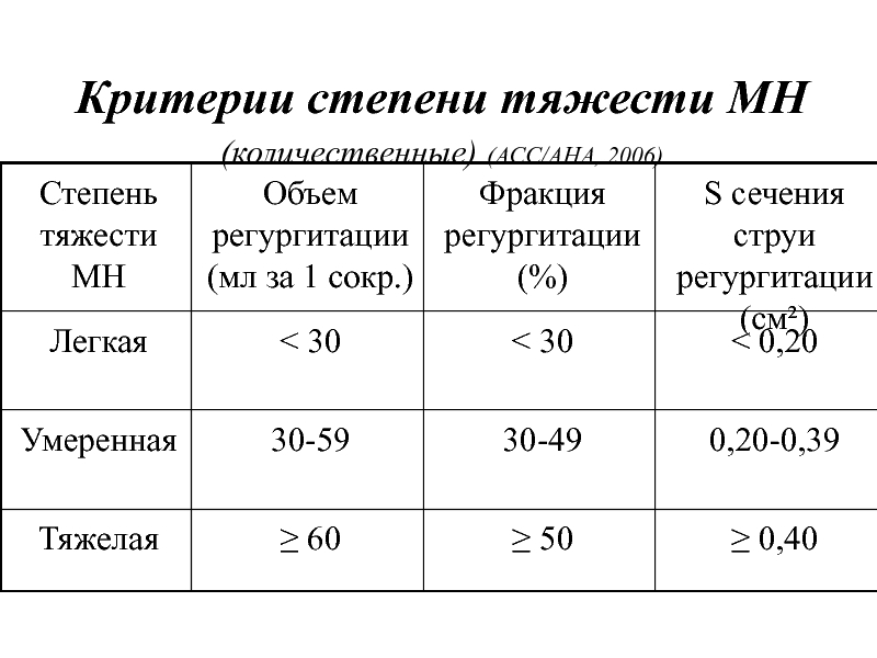 Критерии степени тяжести МН(количественные) (АСС/АНА, 2006)
