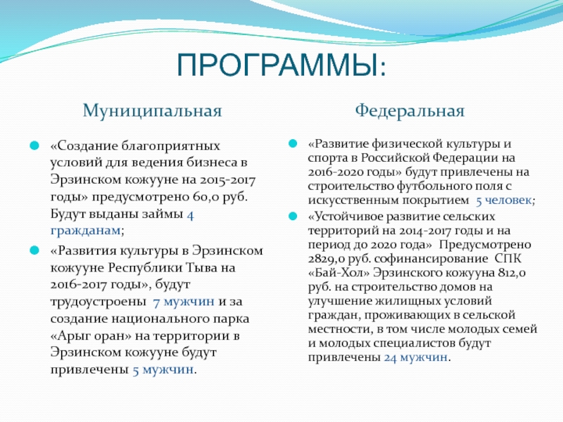 «Устойчивое развитие сельских территорий на 2014-2017 годы и на период до 2020 года» Предусмотрено 2829,0 руб. софинансирование СПК «Бай-Хол» Эрзинского кожууна 812,0 руб. на строительство домов на улучшение жилищных условий граждан, проживающих в сельской местности, в том числе молодых семей и молодых специалистов будут привлечены 24 мужчин.