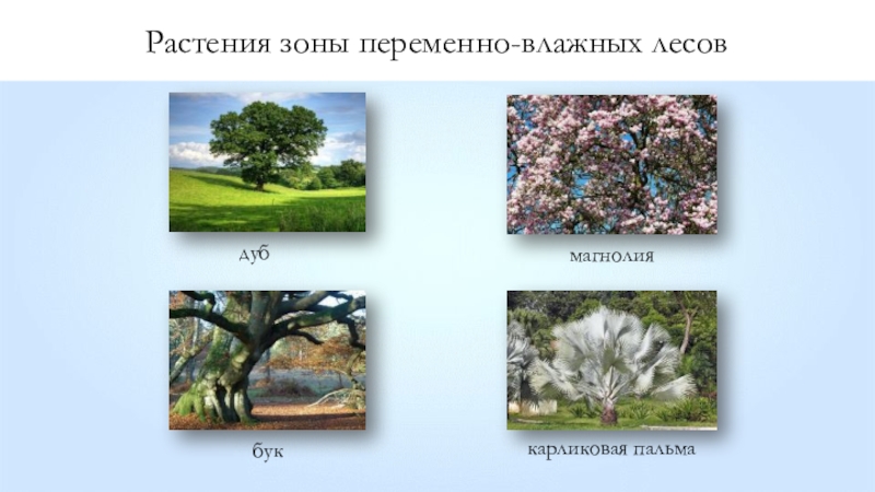 Растения зоны переменно-влажных лесовдубмагнолиябуккарликовая пальма