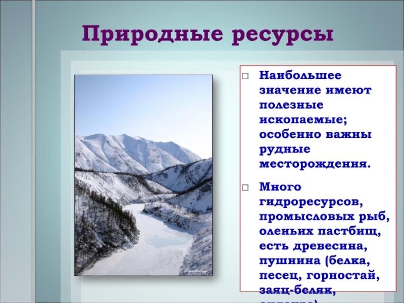 гидроресурсов, промысловых рыб, оленьих пастбищ, есть древесина, пушнина (белка, песец,