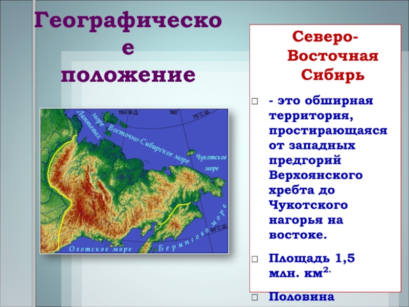 Рельеф Северо-Восточной Сибири разнообразный и контрастный; средняя высота – 1500-2000м.