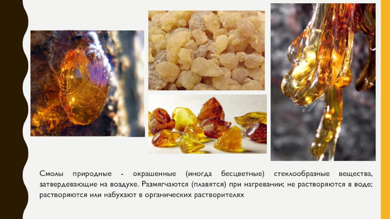 Смолы природные - окрашенные (иногда бесцветные) стеклообразные вещества, затвердевающие на воздухе. Размягчаются (плавятся) при нагревании; не растворяются в воде; растворяются или набухают в органических растворителях